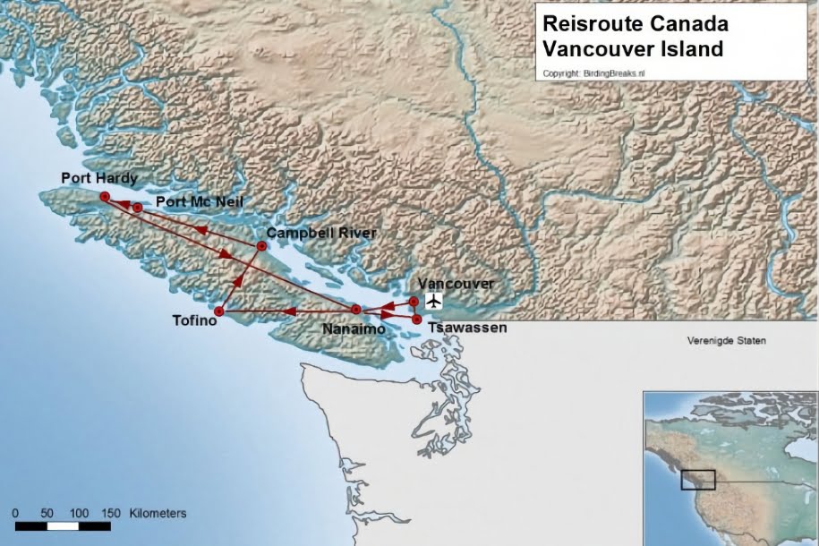 Tijdens het laatste gedeelte van onze reis brengen we enkele dagen door in het ongerepte noorden. De omgeving van Port McNeill is werkelijk schitterend. Vanaf de boardwalk van Telegraf Cove liggen enorme Stellerzeeleeuwen in de haven of op de lichtboeien in de baai. Bald Eagles laten zich vaak prachtig zien en fotograferen op het schiereiland bij Port Hardy. Maar hét hoogtepunt van onze dagen in Port McNeill is zonder twijfel de Orka safari. Kapitein Bill weet de dieren keer op keer feilloos te vinden en kan ons mooie verhalen vertellen. Je krijgt ruim de gelegenheid om de dieren te fotograferen vanaf de stilliggende boot terwijl je luistert naar de dieren door de hydrofoon. Sinds begin jaren 90 maakt de Bultrug ook weer een enorme opleving door nu het dier beschermd wordt. We gaan dus ook op zoek naar deze magnifieke dieren die niet zelden geheel uit het water springen! Bruinvissen en Witflankdolfijnen maken soms een ritje op de boeggolf van onze boot. Na Port McNeill rijden we terug naar Nanaimo. Daar slapen we een nachtje en steken we de volgende ochtend weer over met de boot naar het Canadese vasteland. De laatste dag kunnen we doorbrengen in en rond Vancouver zelf. Of kunnen we op zoek naar de Canadese Kraanvogels rond Tsawassen. De volgende dag vliegen we met volle geheugenkaartjes weer terug naar Amsterdam.