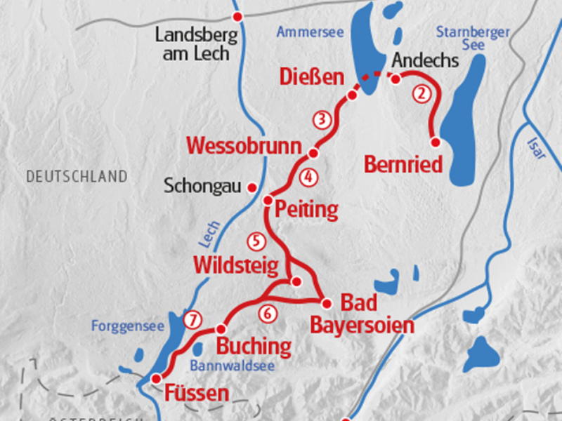 Vanuit Dießen voert de route over weiden en langs de slotkapel naar het stille Stillerwoud. Vanaf de heuveltoppen geniet je van mooie vergezichten. In Wessobrunn bezoek je de historische “Grijze Hertog” (oud belfort) en de monumentale “Tassilolinde”. Bij helder weer is zelfs de Zugspitze zichtbaar in de verte. Overnachting in Gasthof Post of een vergelijkbaar hotel.